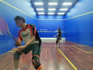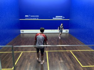 フランス人のEさんは、女性には優しい球出しでラリーを楽しませるジェントルマンなのに、男性相手となると、えげつないスピードのドライブで攻撃的スカッシャーに変貌。