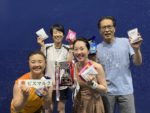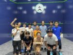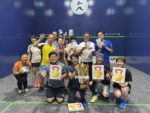 身体が十分温まったところで、2チームに分かれて3/4で7点先取の順位付けをし、それを元に3チームを編成。ランチ休憩もただ食べるだけではないのが、このロングコラボ。この間にスカッシュ検定を実施。9級、10回連続でサーブを左右交互に打つ。8級、自分でストレートの球出し(1/4でショートラインを超える)をしてボースト(サービスラインより低く)を10回連続打つ。今回ほとんどの方々は9級止まり。その中で2名のみ8級合格!!