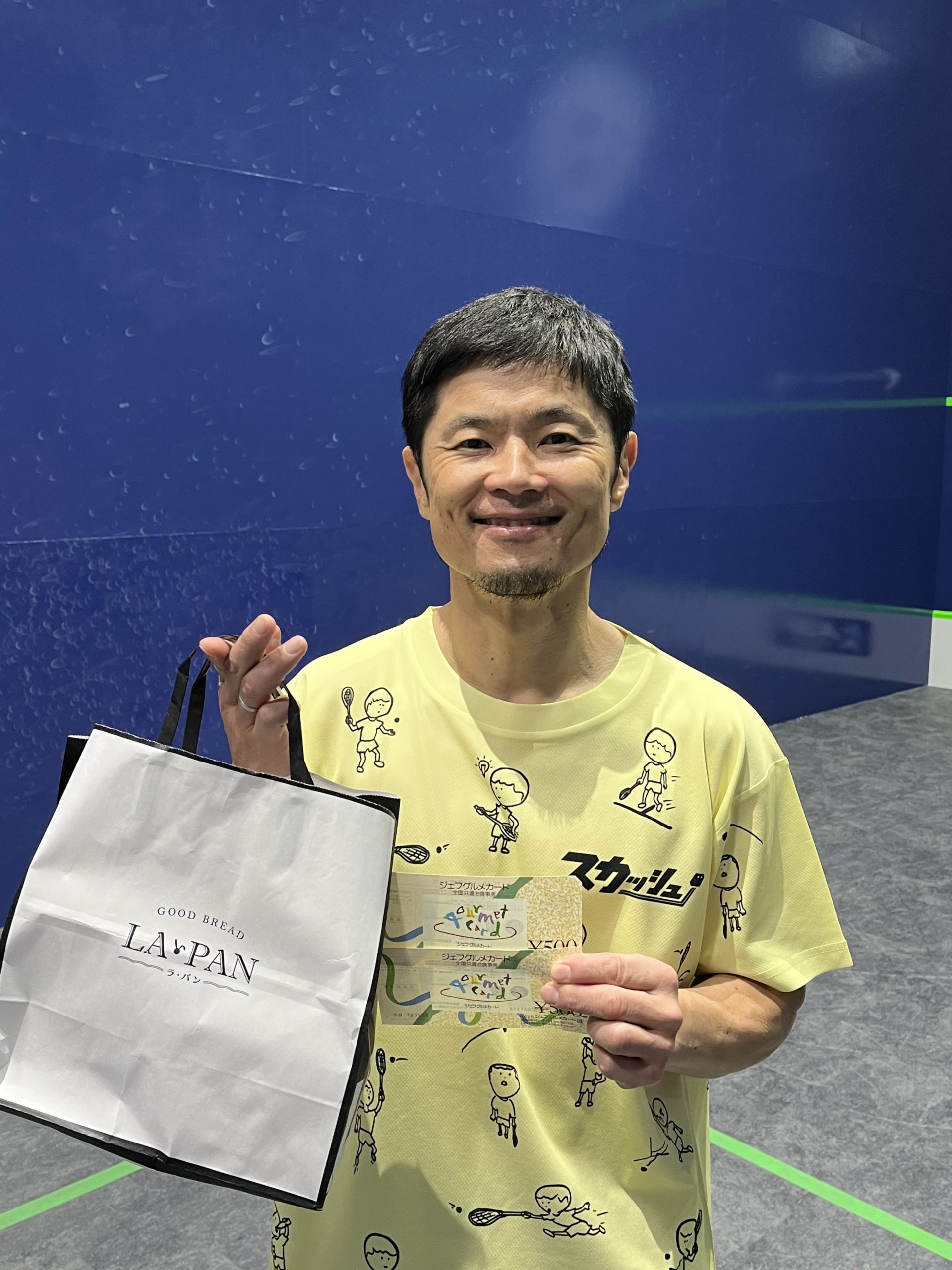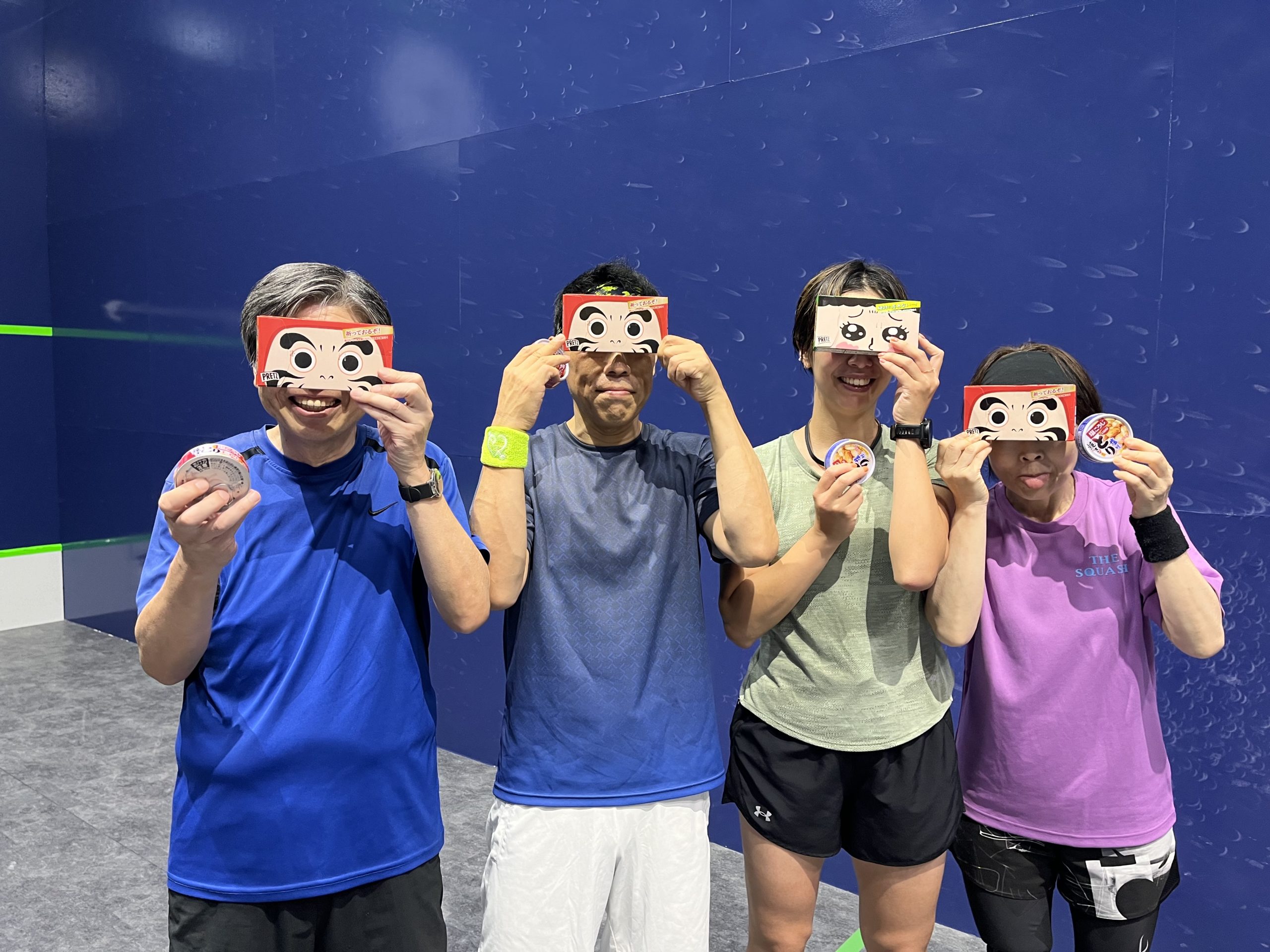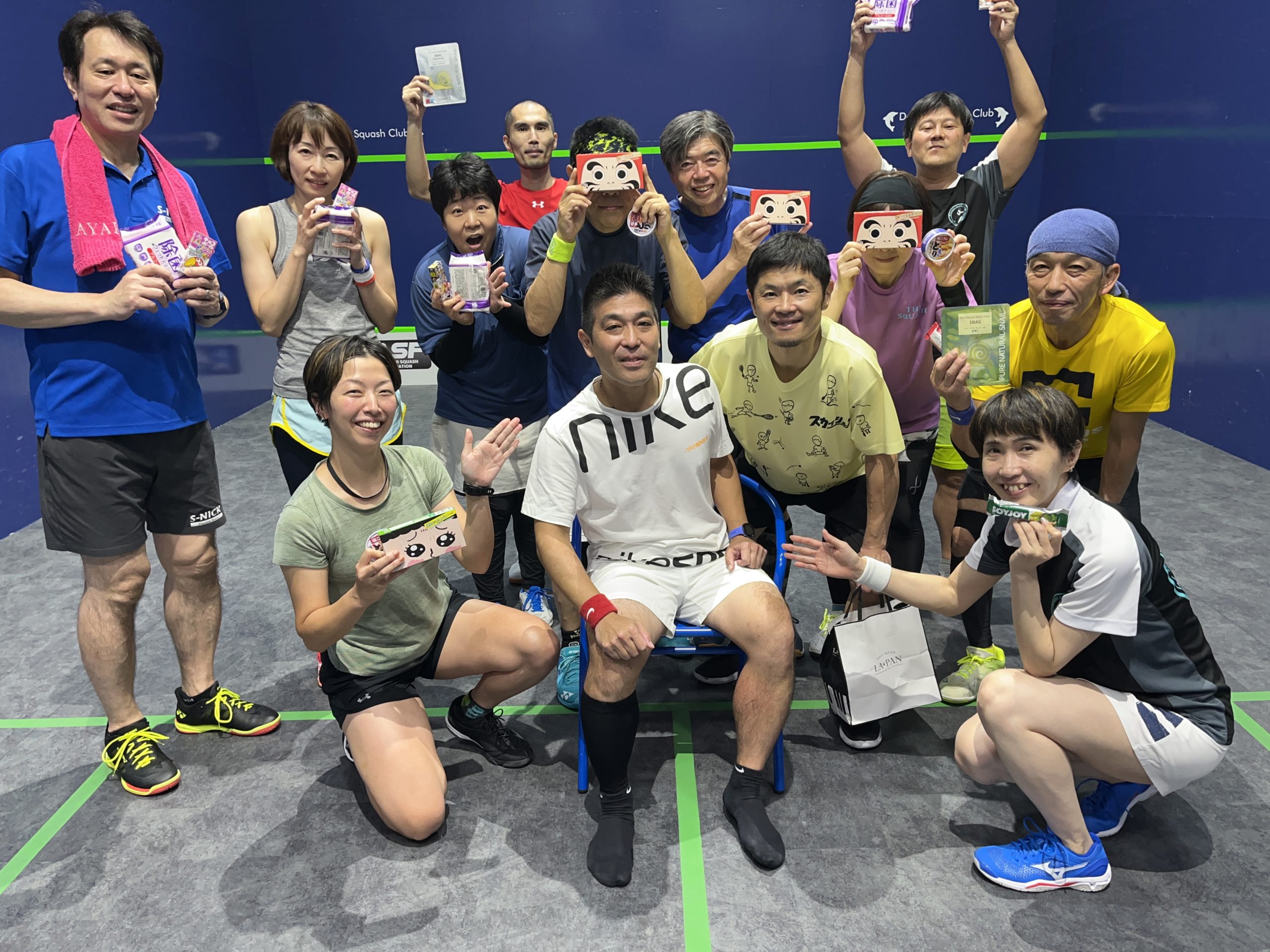 スカッシュを楽しんだ後は、恒例の懇親会。なんと本日がお誕生日という参加者がいらっしゃり、伊藤コーチが素敵なお祝いカードを作成してくださり、みんなでお祝いし、大いに盛り上がりました。