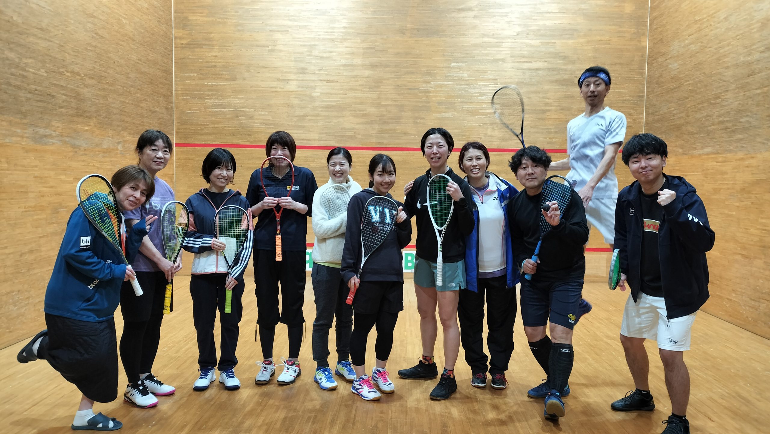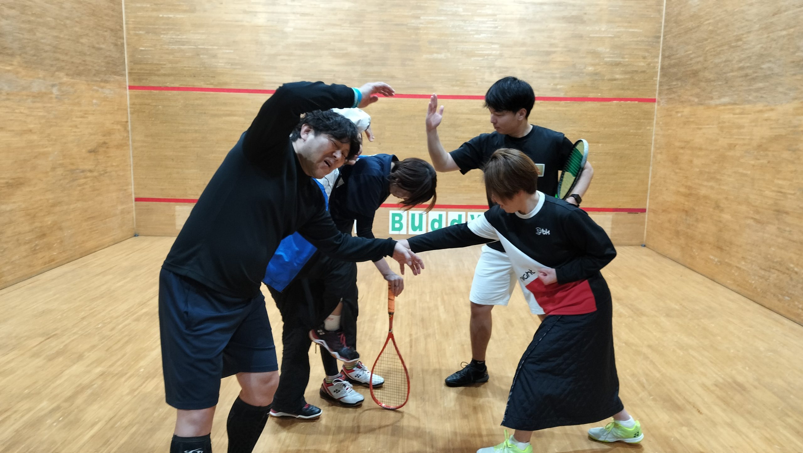 壁がヒノキ張りという珍しいコートで、道下コーチのもと、まずは宮崎(九州)のスカッシャーとの交流スカッシュ会の開始です。